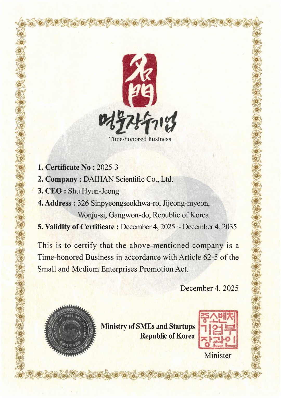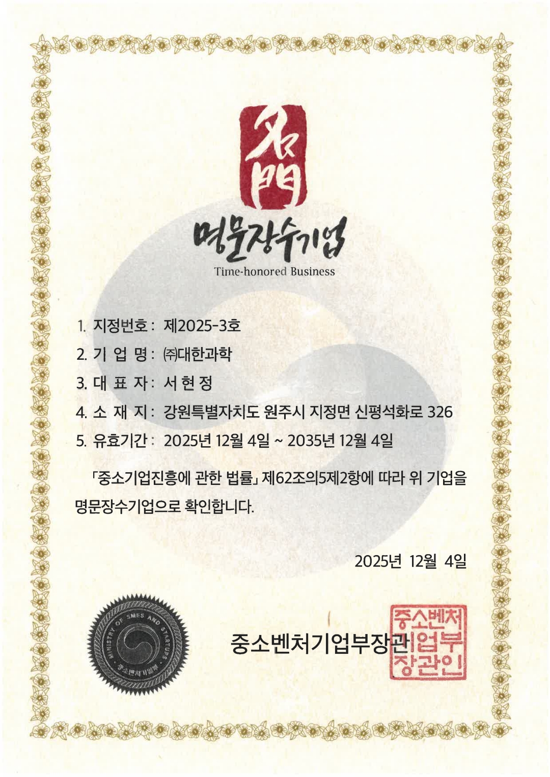 ㈜대한과학이 2025년 12월 4일, 중소벤처기업부에서 주관하는 제10회 대한민국 명문 장수기업으로 선정되었고,